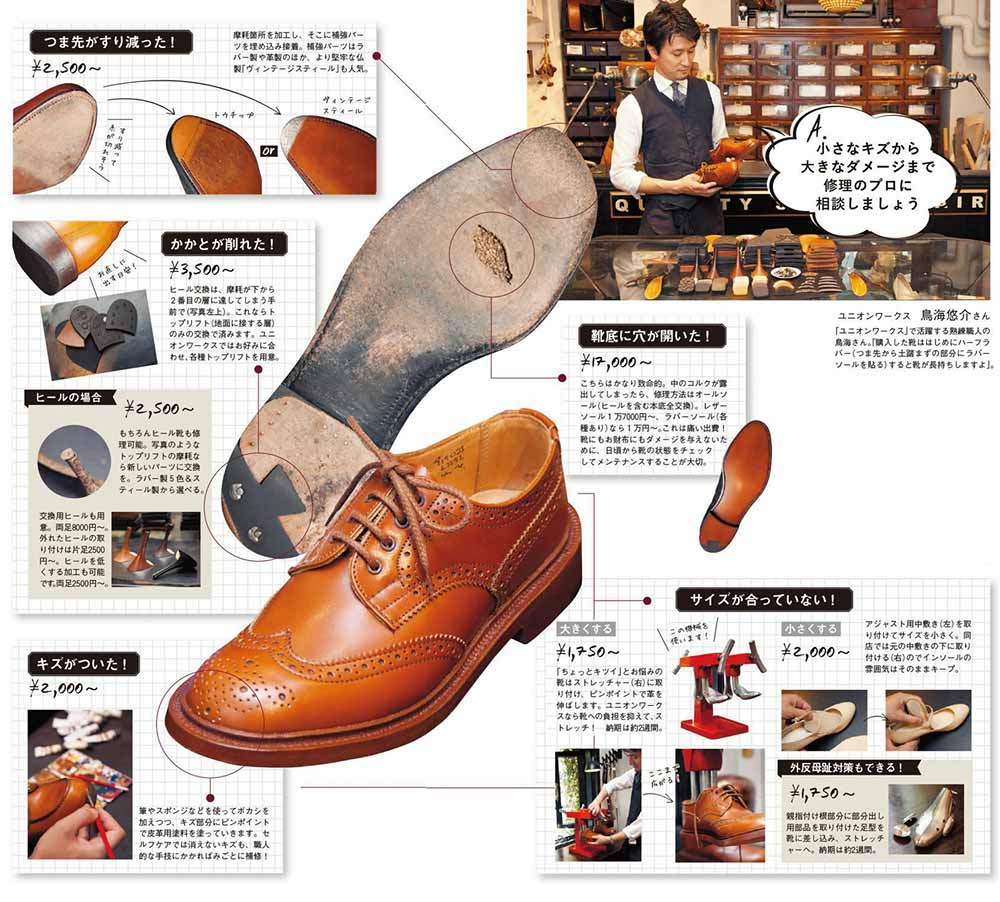 ここでは靴修理で有名な「ユニオンワークス」さんの、よくある修理の依頼例と、そのお値段をご紹介。