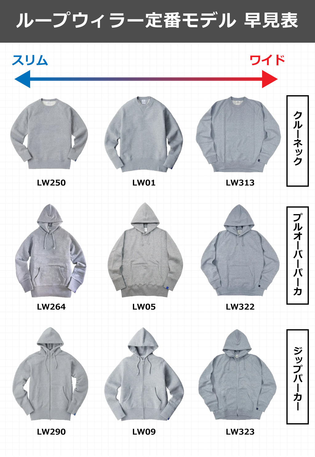 様々なモデル(スウェット)が存在するループウィラーですが、今回は知っておきたい定番モデル9種類をご紹介します。
