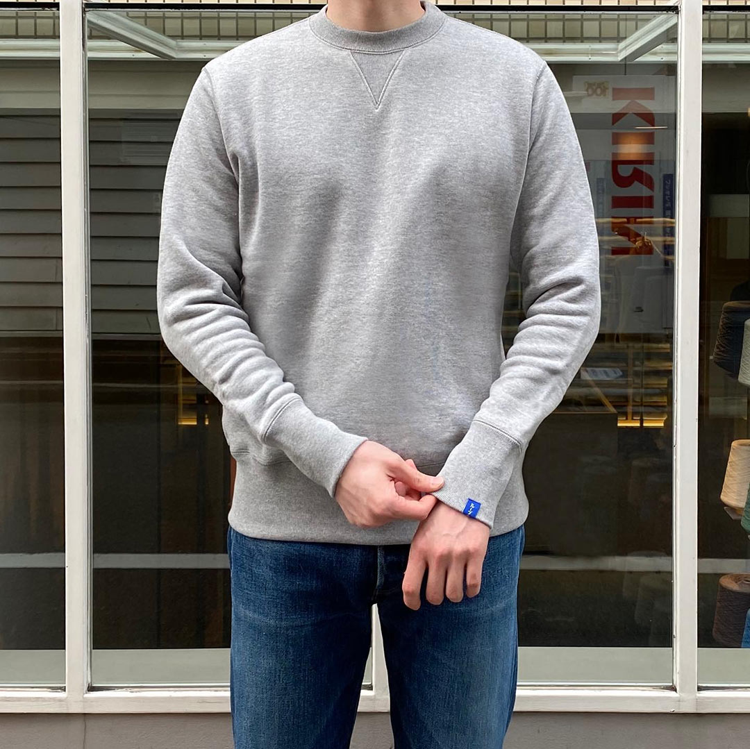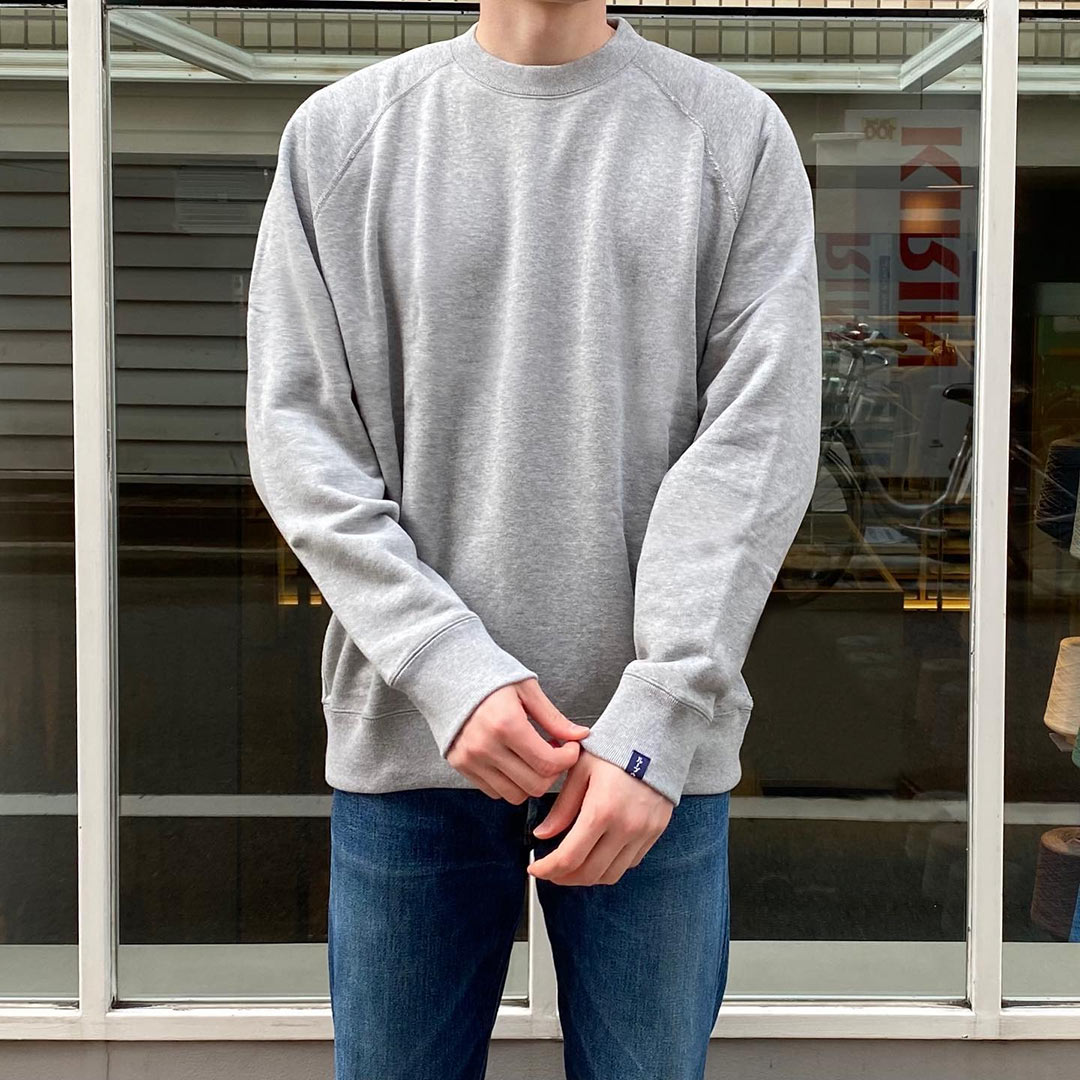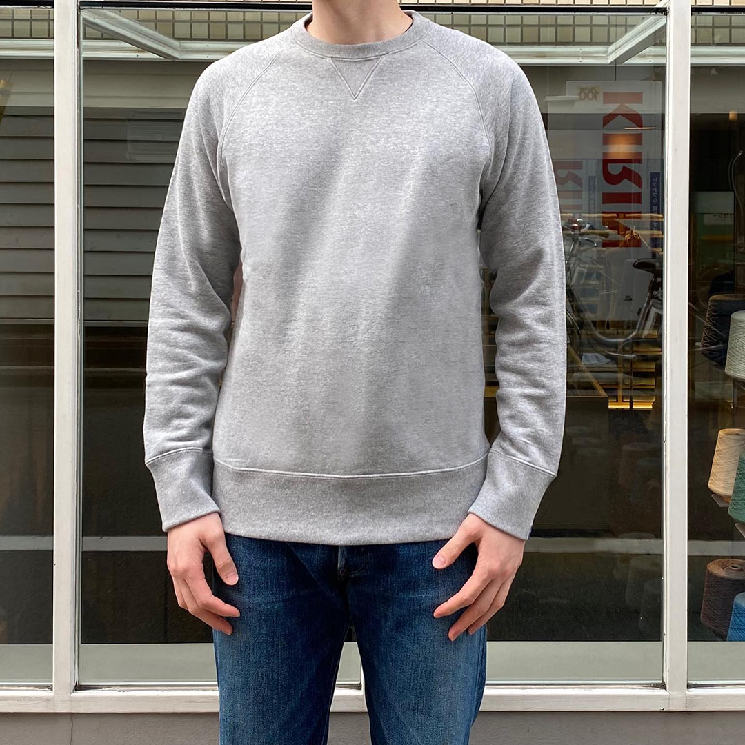 縫い目の無い丸胴、首元の両Vガゼット、長めの袖リブなど、ループウィラーらしい正統派ディテールが特徴。