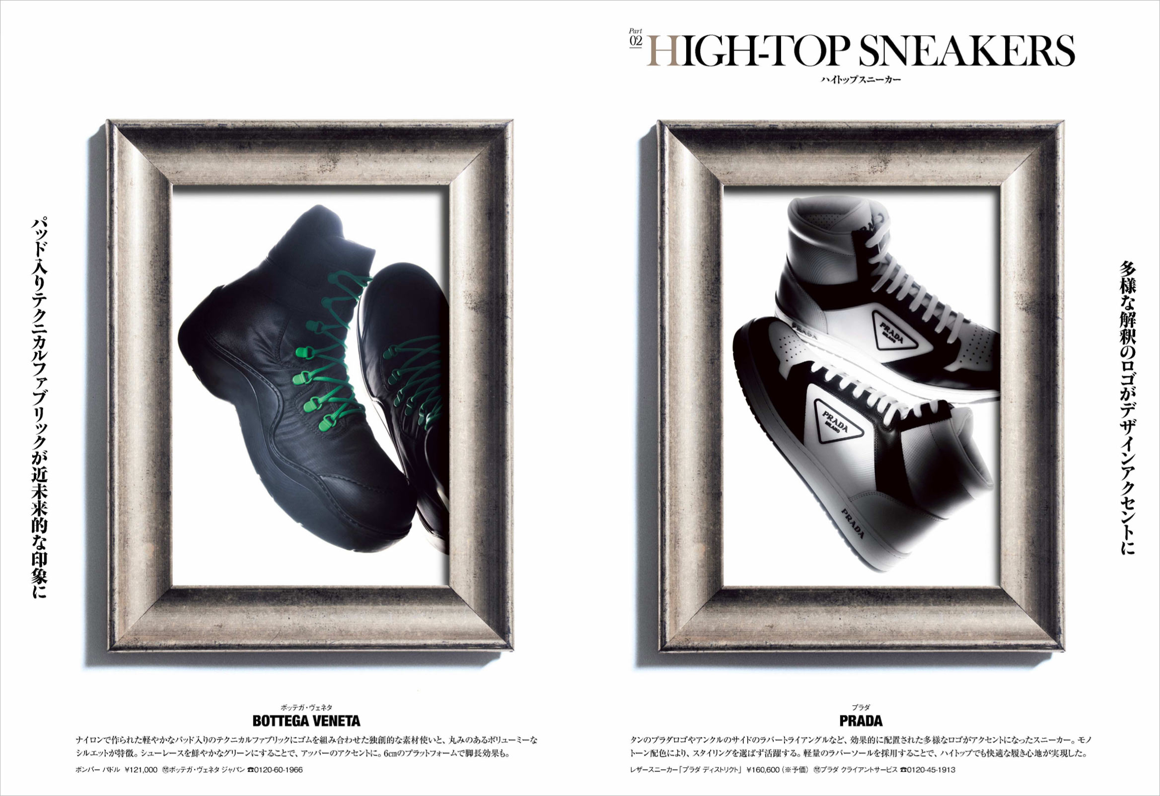 アッパーに「カーフ・ナイロン・ブラッシュカーフ」の3種類を用い、直線的なデザインに仕上げることでモダンと近未来を融合。上記とは逆に”ハイテク”をプラダらしく再解釈。