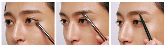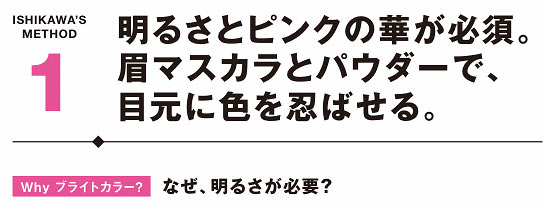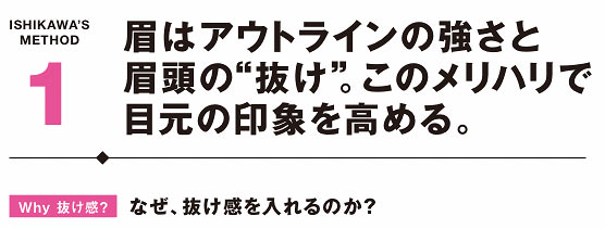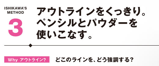 目元の印象を強めて凛々しく見せていくには、ライン感が欠かせない。特にくっきり見せたいのは「眉の下」。ここをしっかりと描くことで印象が引き締まる。さらに眉と同じ色のパウダーで目下、目上に影を足す。