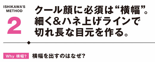 フェミニンでは縦に幅を出すことでかわいくなると解説したが、今回はまさにその逆。横幅を出す、つまり切れ長な目元を作ると印象が強く、シャープに仕上がる。濃いめブラウンをスッとはね上げるようにして目尻に描いていく。