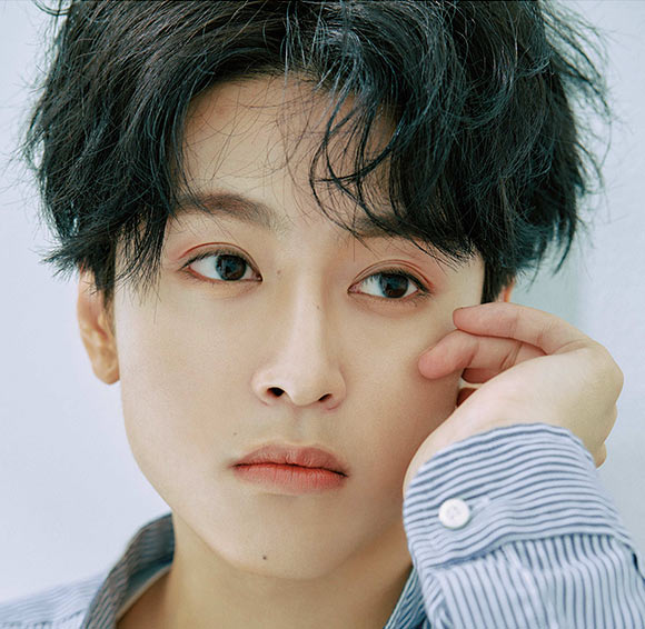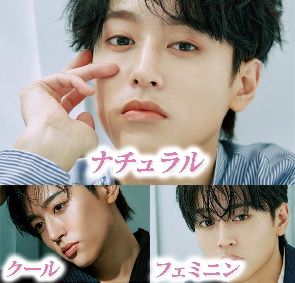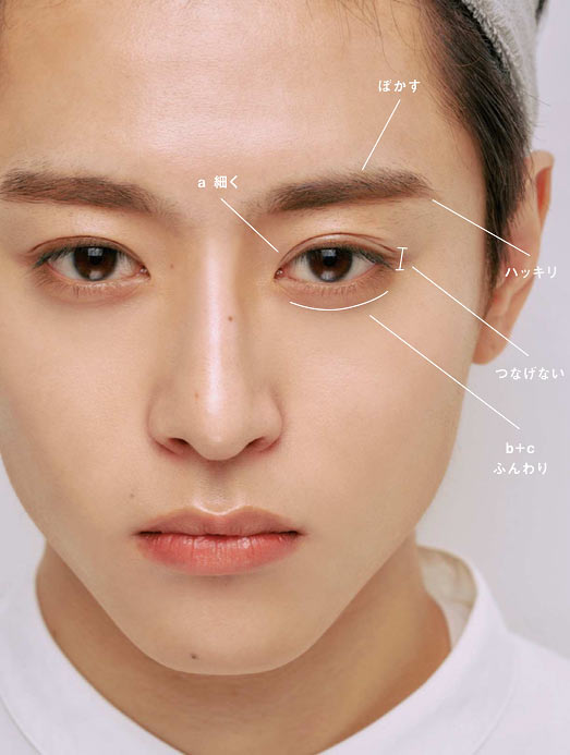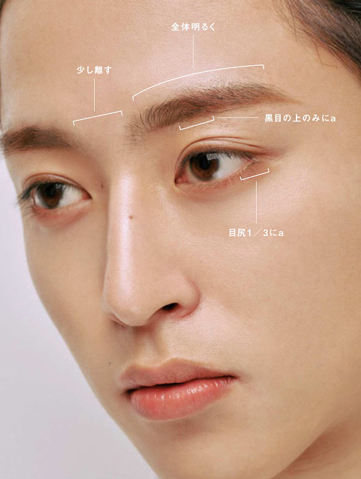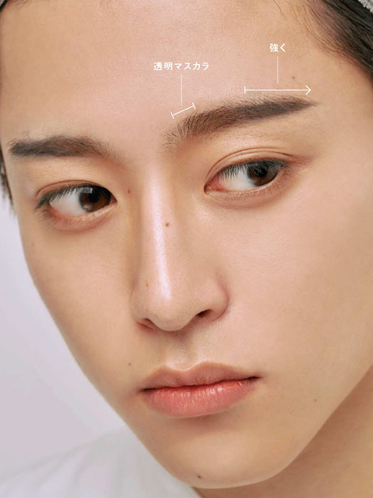 やさしく甘い顔といえば、やはりわかりやすいのがピンクやローズなどの赤系の色。これをきれいに発色させて透明感を感じさせるには全体の明るさが欠かせない。メンズ特有の濃く太い眉をマスカラでトーンアップしてからメイク開始。