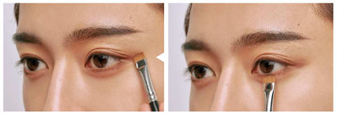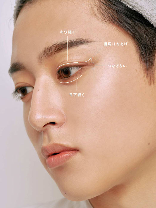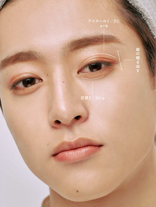 男女問わずかわいさを強調するには縦の幅を出すことが大基本。反対に横に幅を出すとクールな印象になる。そこで今回は縦にアイシャドウをのせていくが、下はライトカラー、上はミディアムカラーと濃淡を変えて深みとニュアンスも加味。