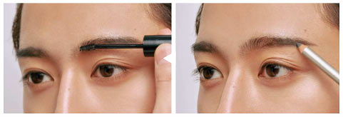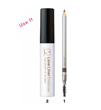 自眉に近い1のグレイッシュなブラウンのペンシルで眉頭を外し、ラインを描く。黒目の外側から眉尻にかけて徐々に濃くし、強さを出す。続いて眉頭のみ、毛流れを整え、ツヤを与えるよう、2の透明マスカラをのせる。