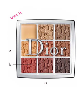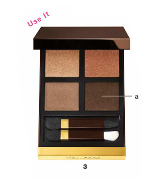 先にコンシーラーで黒目の下をカバーしておく。3のaを下まぶたの目頭2/3にのせて透明感を出す。これによりメソッド1の締め色が効く。上まぶたの目尻側のアイホール1/2には3のaとbをふんわりとオン。
