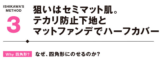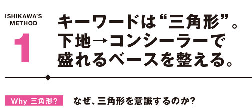 三角形で塗る意味はもうひとつ、塗らない部分ができること。素肌の赤みなど多少のアラを残すことで自然な印象に仕上がる。1の下地、2のコンシーラーとも肌にのせたら、外に向かって指ですべらせるようにのばす。