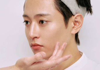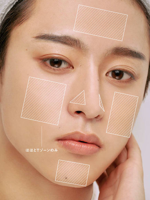 ファンデは使わず、下地とコンシーラーで肌を整え、眉頭の下、輪郭、あご下にポイントでシェードを入れて自然な陰影を演出。この肌作りをメンズメイクの基本としてマスターしたい。