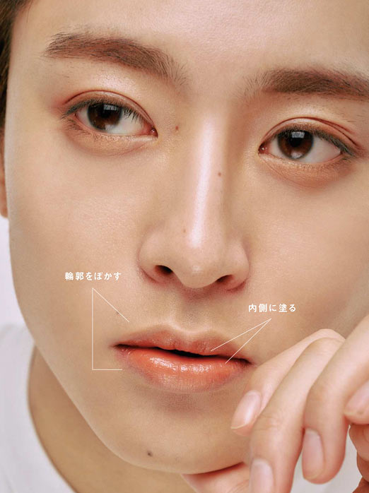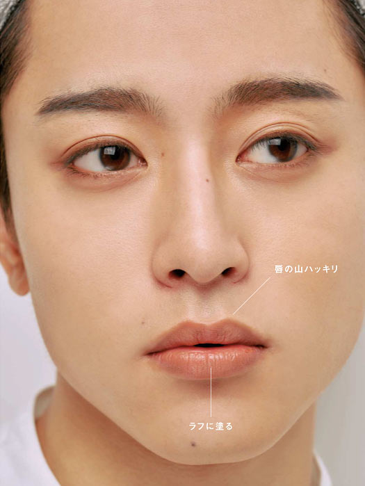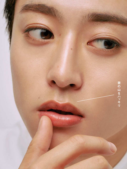ナチュラルさの中に男らしさを感じさせるにはリップがポイント。くすみ系カラーのペンシルで縁取り、色味はやさしいが、ラインはしっかりを狙いたい。ここで顔に強さを忍ばせる。