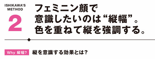 フェミニン顔の主役は色。赤み系の目元とリップで華やかさを盛るが、トゥーマッチにならないよう、ラインをぼかし、肌と眉は軽やかに仕上げるのがキモとなる。