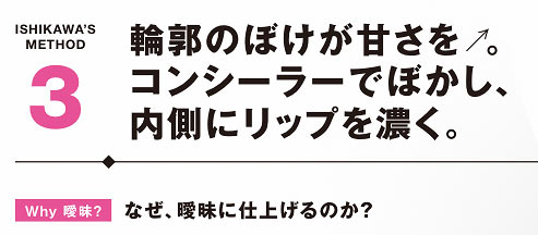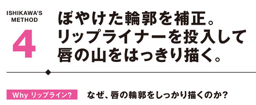 ここでのリップの役目はほどよい血色感と立体感を出して、目元を引き立てること。シャープさに強さは必須のため、輪郭はきっちり描くが、に塗る。メリハリがポイントだ。
