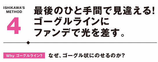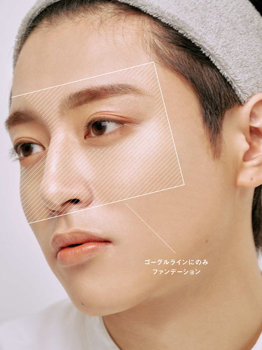 ファンデーションを最後に使う理由はやりすぎを防ぐため。最初に肌をつくると、どうしても完璧にしようと厚塗りになりがち。今回ファンデは脇役。アイメイクを引き立てるために、目元周辺のゴーグル状にのせて明るさを一段アップ。