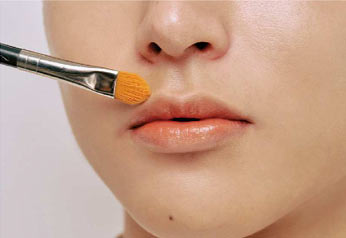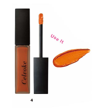 コンシーラーを筆に取り、唇の輪郭のやや内側はみ出すようにのせてぼかす。上下とも行い、内側にリキッドリップで色と質感を発色させる。4のマットオレンジをチップに取り、左右に往復させてたっぷりと塗る。