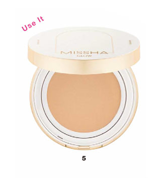 5のクッションファンデを含ませ、軽く上から押し当てるようにしながら、顔の中心から外側に向かって塗り広げる。全顔塗る必要はなし。ゴーグルライン状を意識して明るさがほしいところのみでOK。