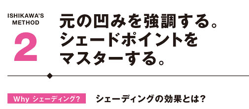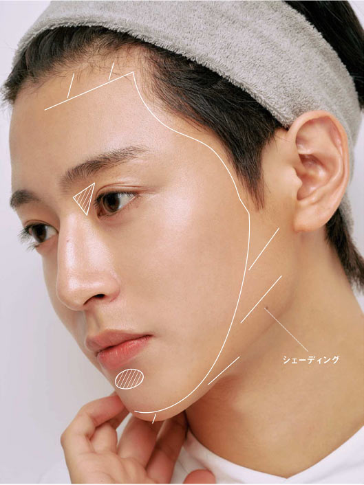 男性のメイクにおいて骨格感を生かすことはマスト項目。女性のように色味や質感を強く効かせないぶん、陰影が大事なファクターとなる。入れる部分は「輪郭」「眉頭の下」「あごの下」の3つのポイントを押さえよう。
