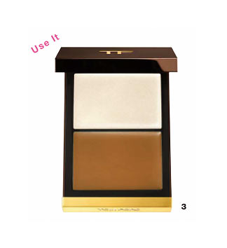 3のダークシェードをブラシにとり、輪郭上をすべらせるようにオン。続いて、眉頭の下とあごも、細めのブラシでとってスッとのせる。元の凹凸を生かし、不自然さを感じさせないナチュラルな陰影を仕込む。