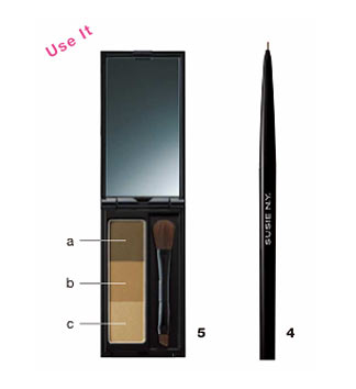 眉下のラインを4のペンシルで強調し、眉全体に丸筆で淡く5のbをのせ、眉上をペンシルで1本1本描く。上はくっきりさせずぼかすと自然に仕上がる。目元は目のキワを5のaで締め、目の下を目尻から目頭に向かって5のb+cをミックスさせて丸筆で淡くのせる。