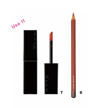 まず6のリップペンシルで上唇の山を描き、口角へとつなげる。下唇も輪郭に沿ってラインを引いて形づくる。続いて、7のマットな質感のリップで唇の上下を塗って色味と質感を整える。最後に必ずティッシュオフをしてなじませることが大切。