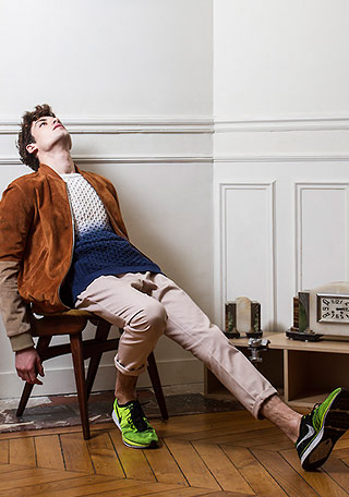 ブラウンジャケット+ベージュチノパンを、鮮やかなカラースニーカーで着崩す。
