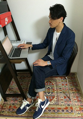 ナイキのスニーカーはカジュアルダウンとしても活躍。カッチリとしたジャケットコーデをこなれた感じにしてくれるので、休日、街用としてもありです。