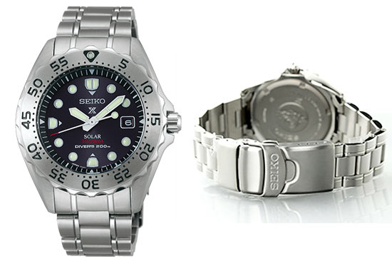 ダイビングに耐えうる「200m潜水用防水」。さらに4,800A/mの直流磁界にも影響をうけない耐磁性能、ソーラー充電機能、デイト表示など高い実用性を兼備。