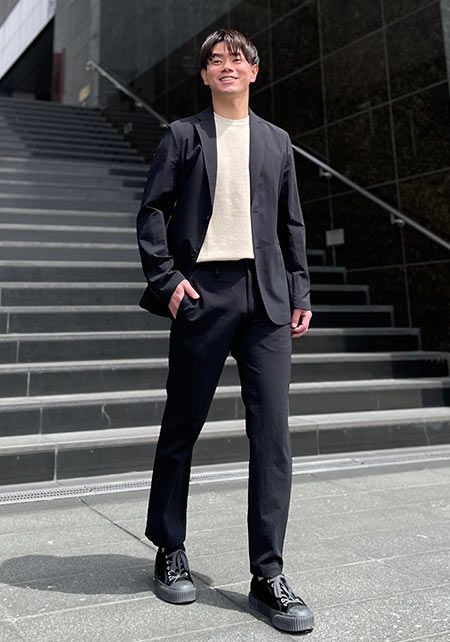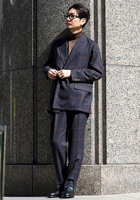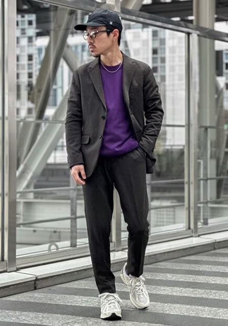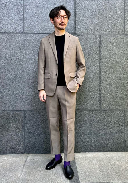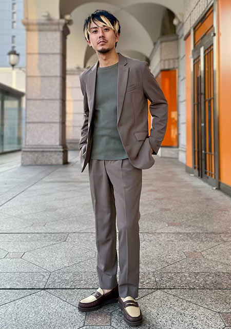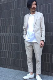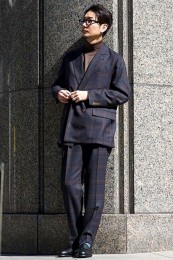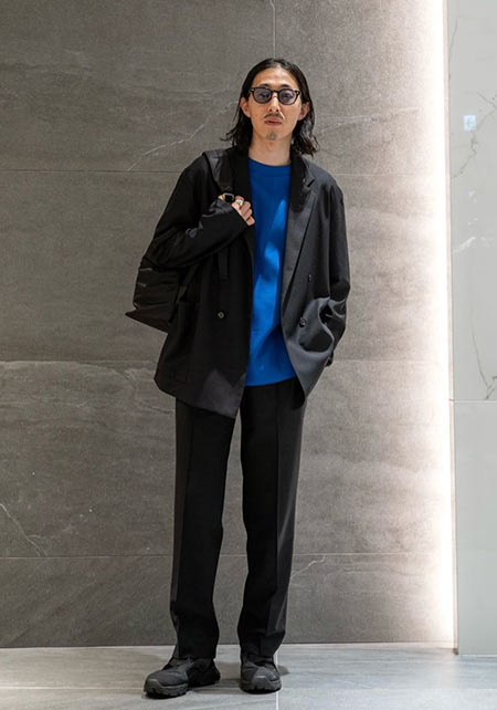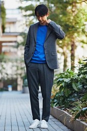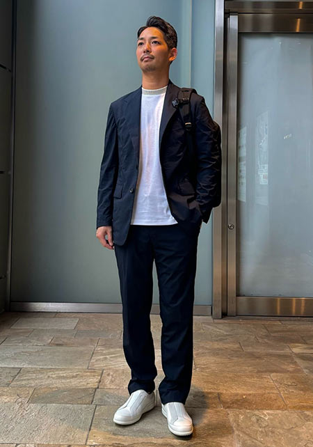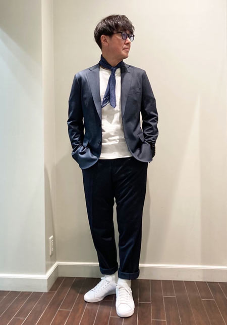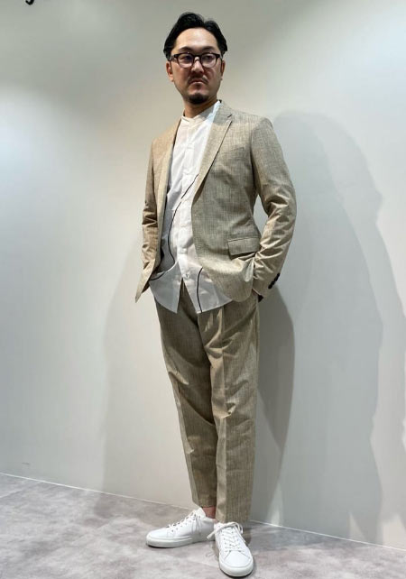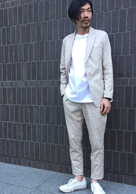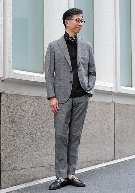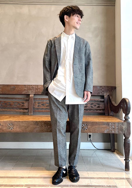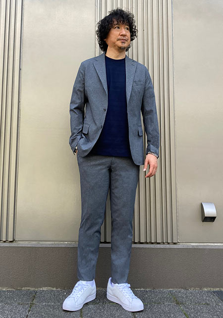 セットアップは、着た時点で装いの大部分が決定します。なので、時々小物を盛ったり、インナーや足元にスニーカーを用いたりしても、全体の世界観が大きく崩れることがありません。