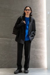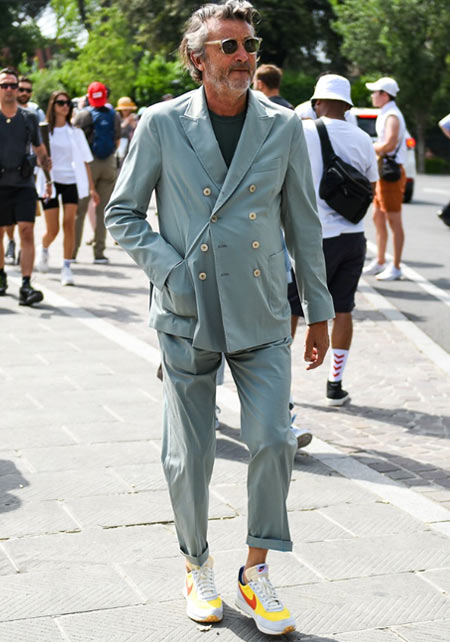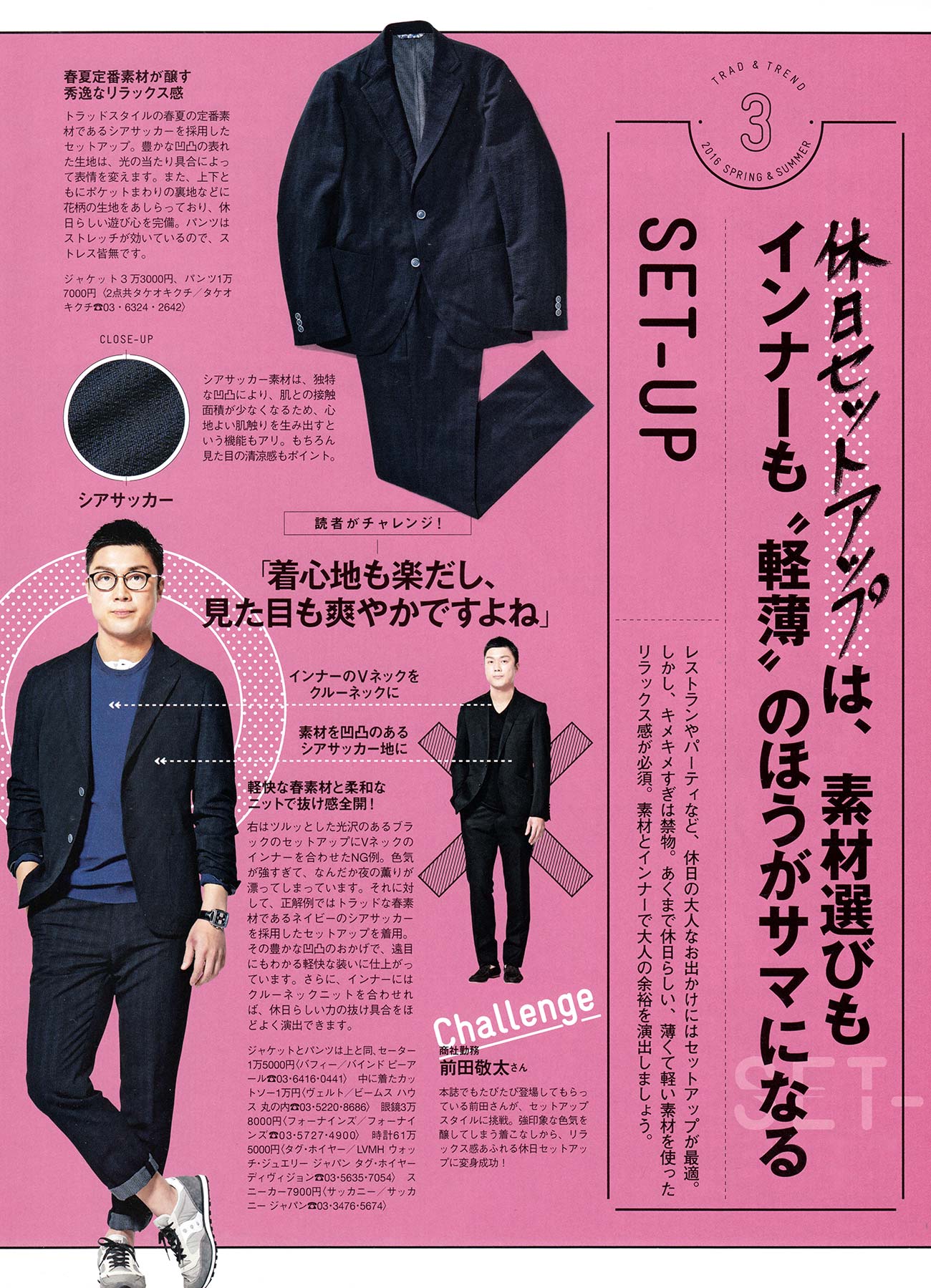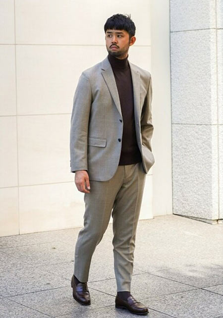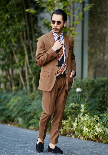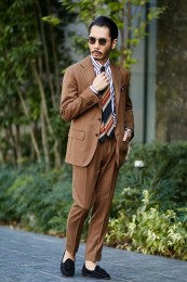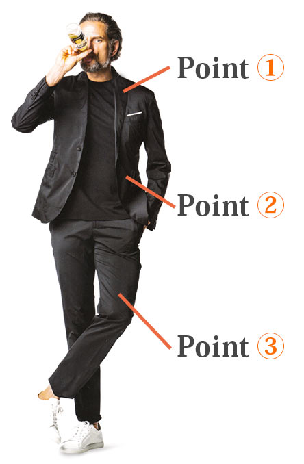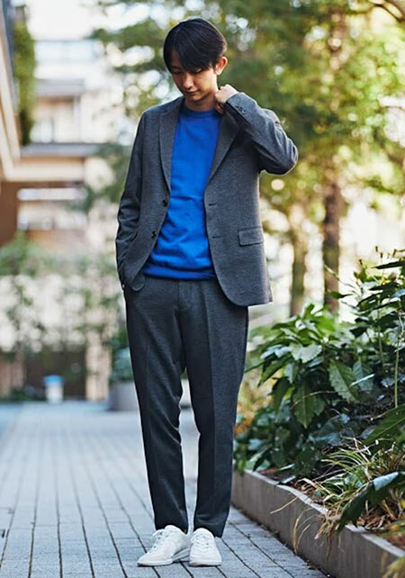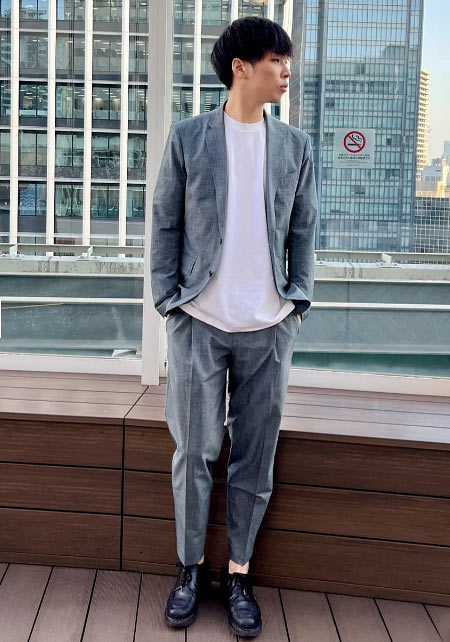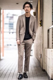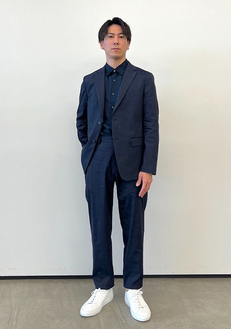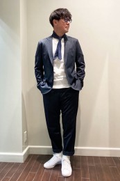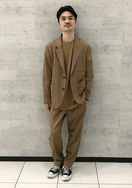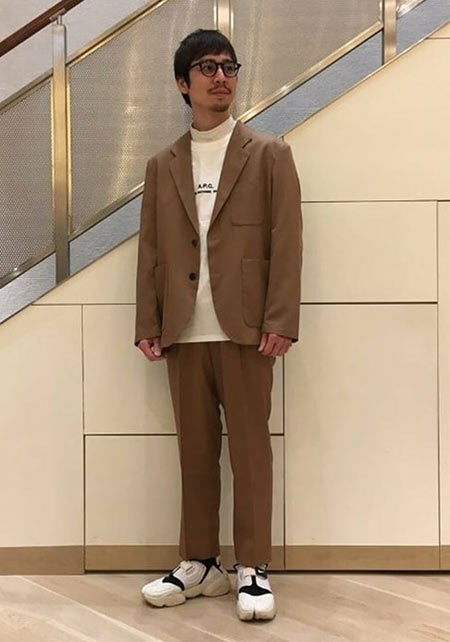 セットアップは、着た時点で装いの大部分が決定します。なので、時々小物を盛ったり、インナーや足元にスニーカーを用いたりしても、全体の世界観が大きく崩れることがありません。