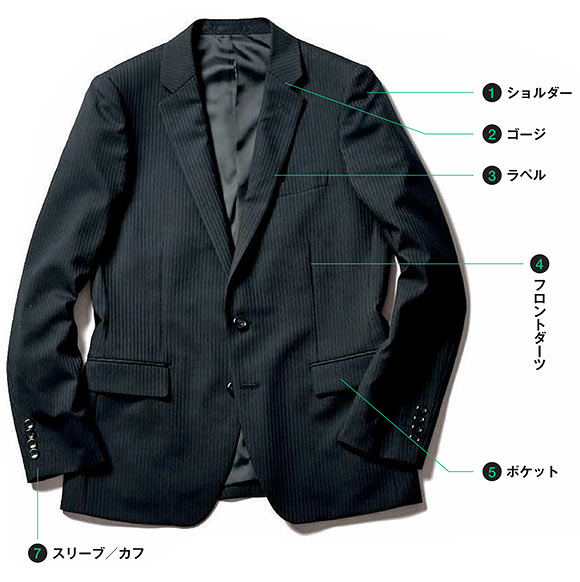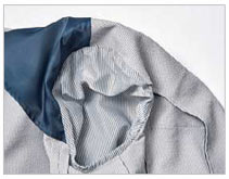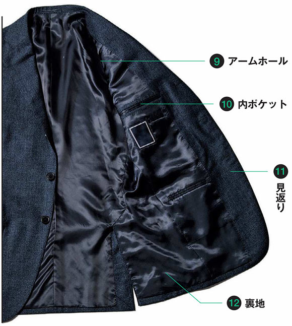 ジャケットの身頃と袖をつなぐ部分、いわゆる腕を通すところ。ここが窮屈だと、生地や糸にダメージをあたえてしまうので注意が必要。