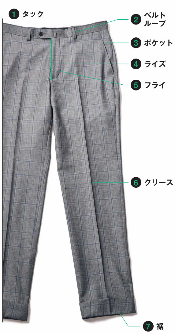 両脚の中央にある折り目のこと。これがきちっと入っていると、シルエットが美しく見える。