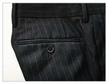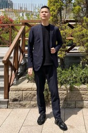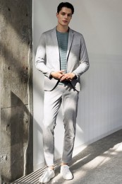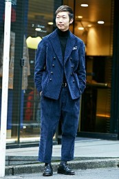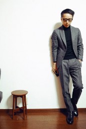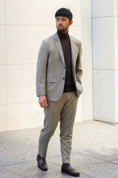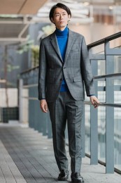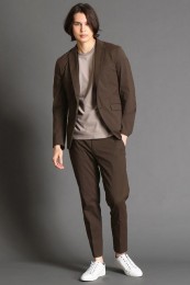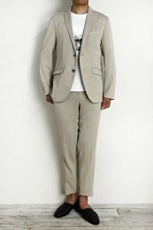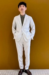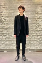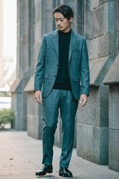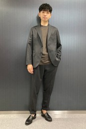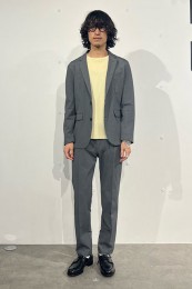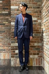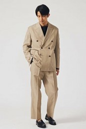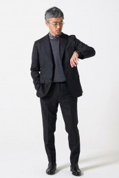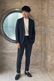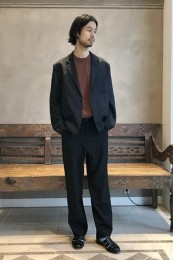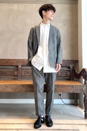 8ボタンのピークドラペルのダブルのジャケットと、1プリーツスリムテーパードパンツによるセットアップです。ヘリンボーン柄にクラシックな印象漂うストレッチ素材を使用。