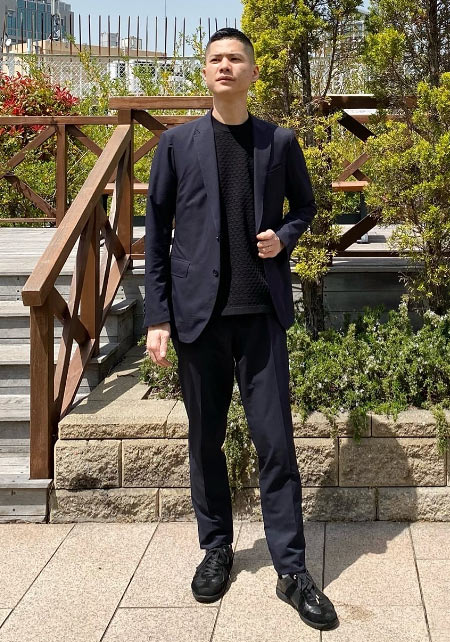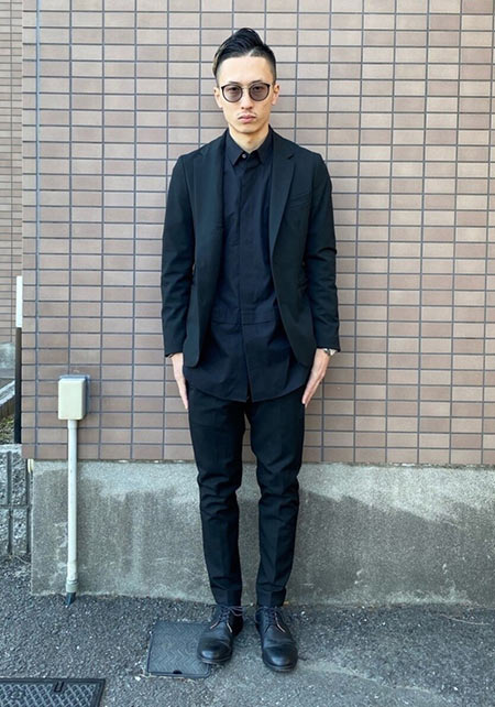 〈コーデ〉全体をモノトーンでまとめたコーディネートは、ストイックで信頼性の高い雰囲気を演出。黒でもシアサッカーなら涼しく快適かつ、クールに振舞えます。