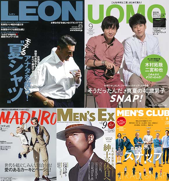 雑誌掲載はOCEANS、POPEYE、UOMO、メンズクラブ、Begin 他多数。