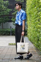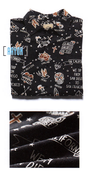 〈右〉まさしくシックに着られる、オヤジの柄&開襟シャツです…。ソフトで落ち感の良いビスコースと、モノトーンのパームツリー柄がクール。同ブランドらしいやんちゃ感と都会的なテイストが絶妙に同居している一枚です。