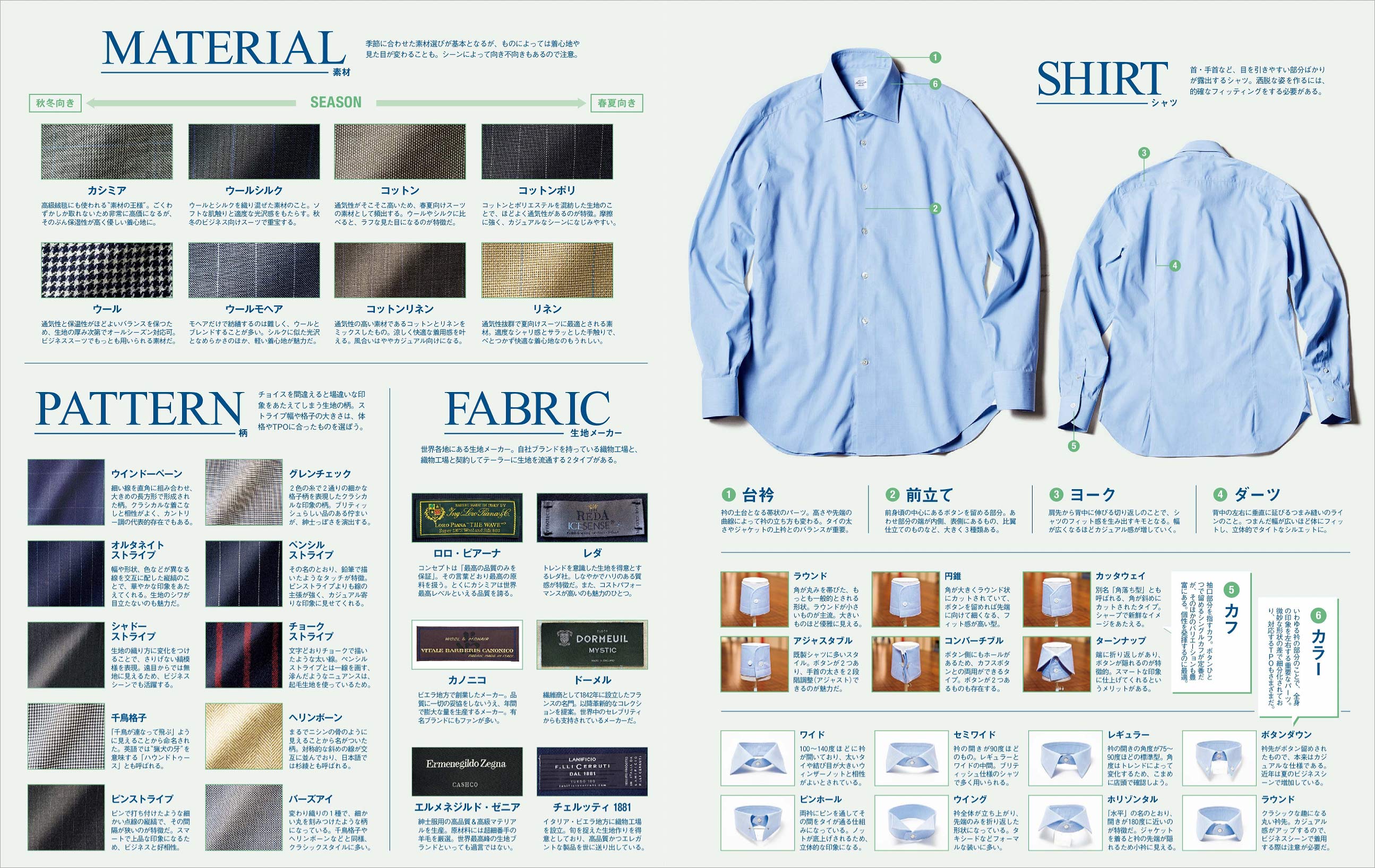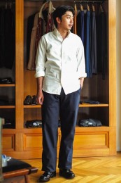 伊国や英国シャツとは異なる、小ぶりな襟が特徴で、セミオーダーでは前合わせの裏に好みのグログランテープを貼ることも可能。色気と個性を併せもつシャツが作れます。