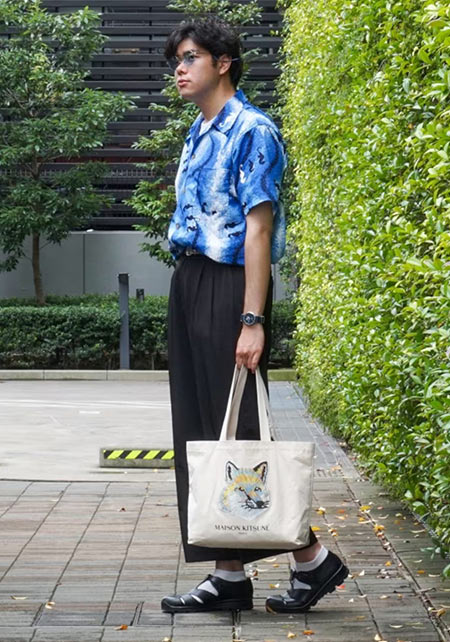 〈左〉お茶目なプリント意匠がお洒落のアクセントに…。ほどよく肉厚なコットン製の黒半シャツ。前身のビスマークと後身には、ウサギのモチーフがプリントされているため、お茶目な演出にもひと役買ってくれる。