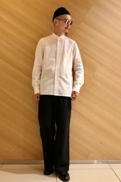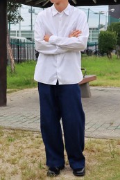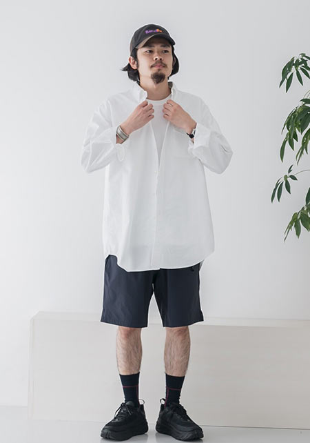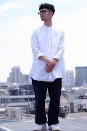 1980年代に発表されたボックスシルエットと開襟使用を現代に蘇らせた一枚。素材に白のブロード地を用いることでカジュアルながらも上品な印象を表現。