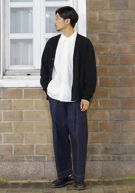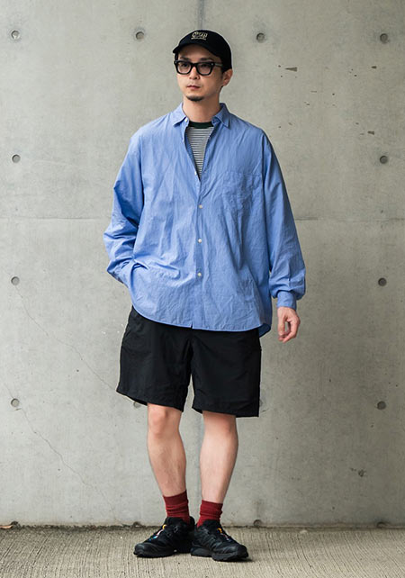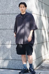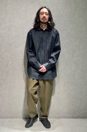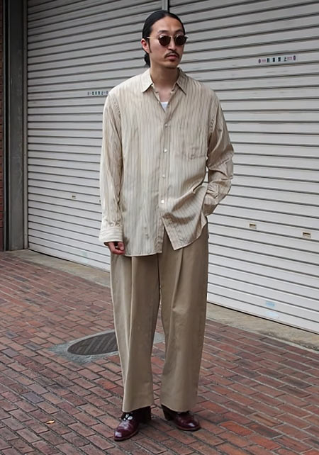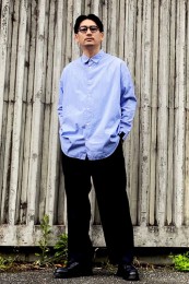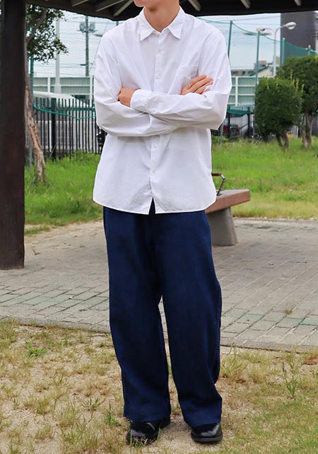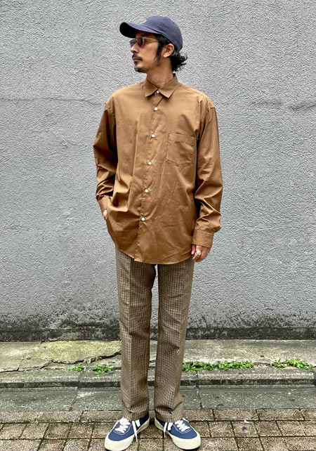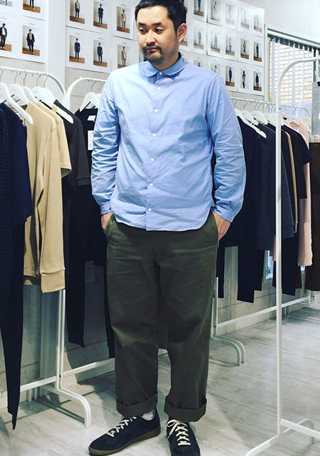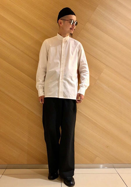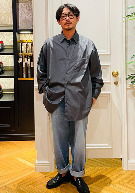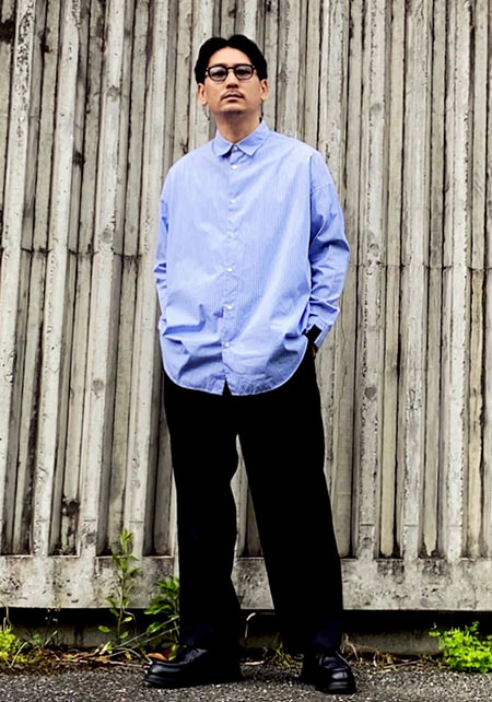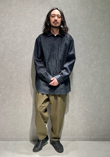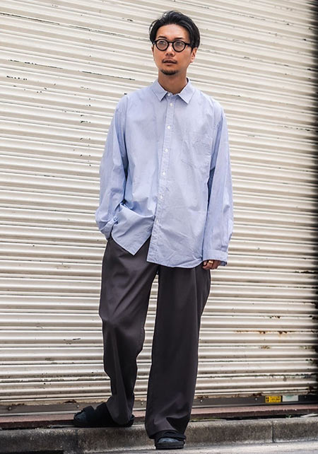 レギュラーカラーのシャツも毎シーズン高い人気を誇る。定番でありつつ、ゆったりと肩が落ちる独特のシルエットはコモリならでは。