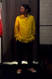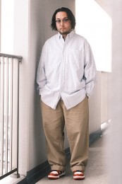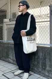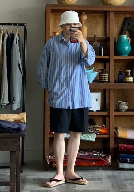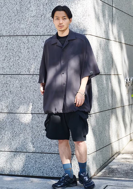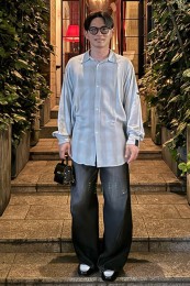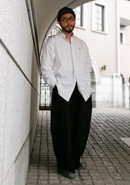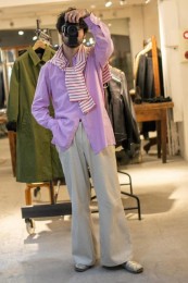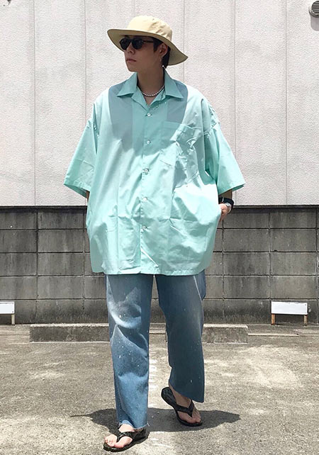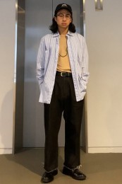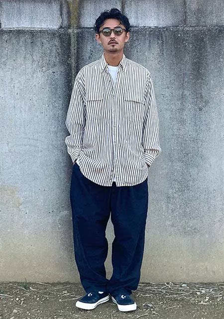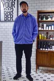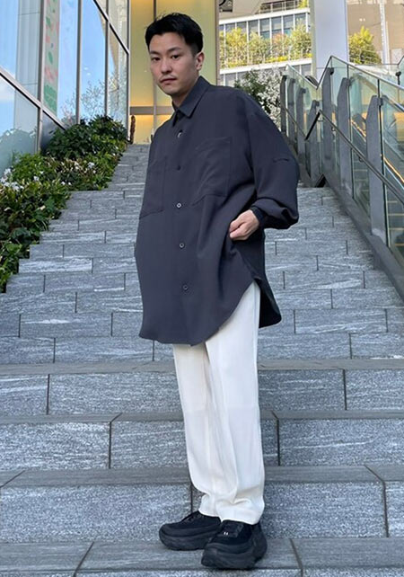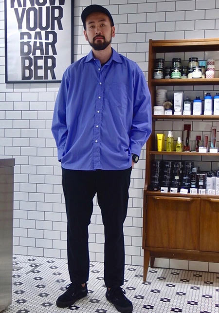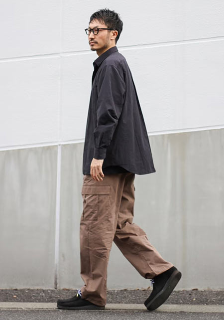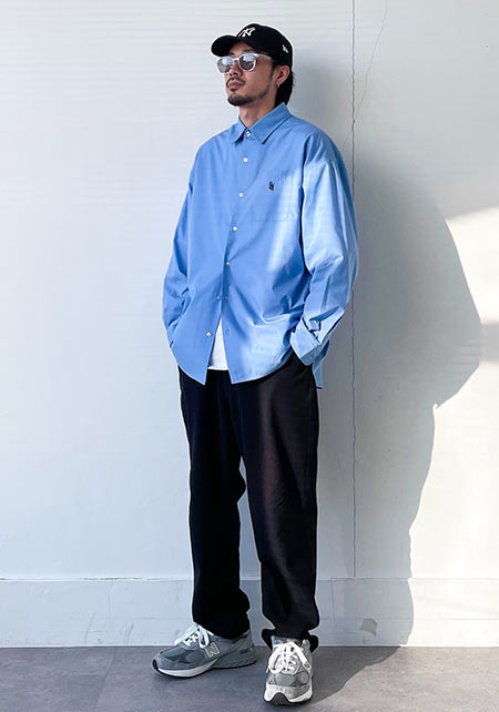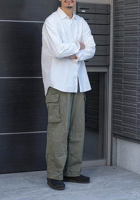 レギュラーカラーのシャツも毎シーズン高い人気を誇る。定番でありつつ、ゆったりと肩が落ちる独特のシルエットはコモリならでは。