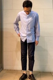 それでいて巧みな製品洗いで綾織りの生地の味を上品に高めているのがミソ。得意とするホリゾンタル襟はジャケットとの相性も抜群。