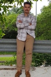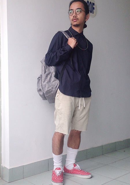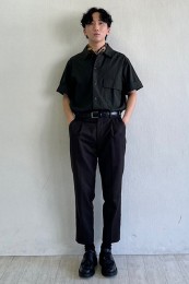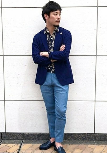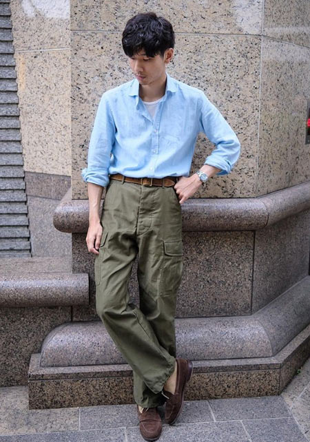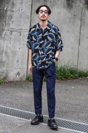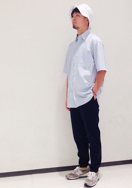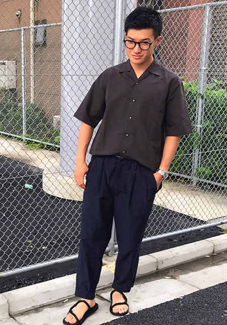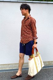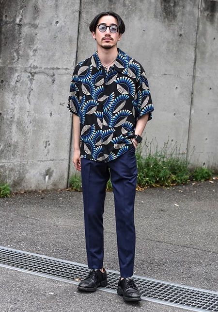 〈コーデ〉半袖シャツのカジュアルコーデとはいえ、トータルなイメージとしては大人っぽく着こなすのがモテる秘訣。総柄のネイビー柄コットンパンツなどで、視覚的にもクールに攻めましょう。