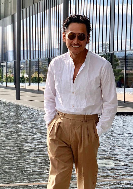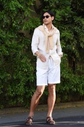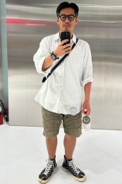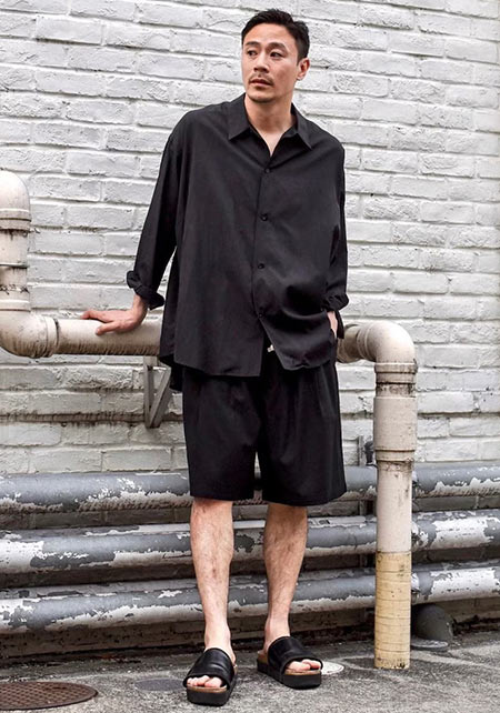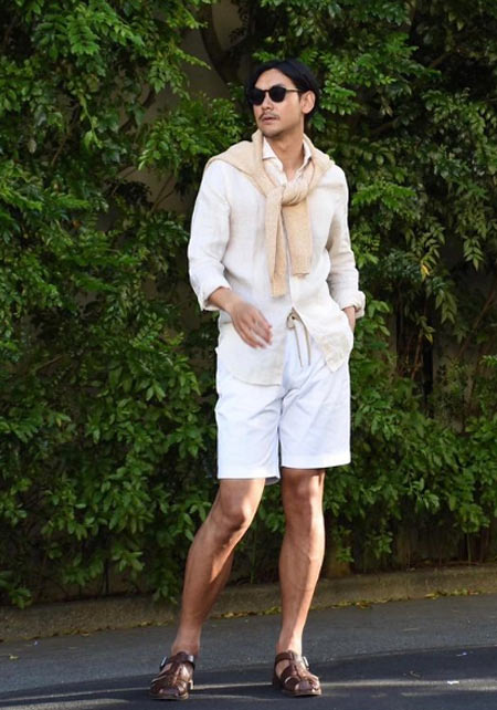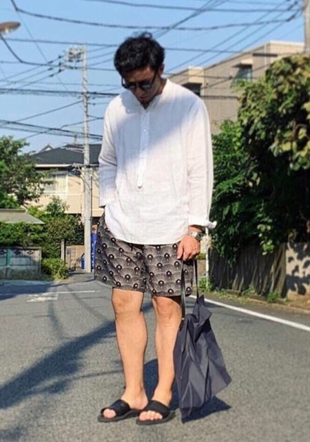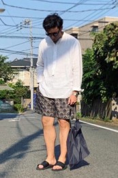 〈コーデ〉独特のオリエンタル柄が特徴的な開襟シャツは、ほどよくタイトなラインが上品に見せるポイント。胸元はリッチな時計で若者と差別化するのがオヤジの半袖スタイルです。