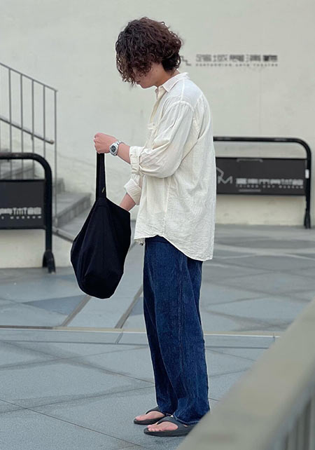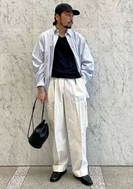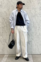 ドロップショルダーのやりすぎないモード感が分かりやすくて洒脱。モダンかつヌケ感が備わっており、これが春夏らしいお洒落さを大加速させる役割を果たしてくれます。