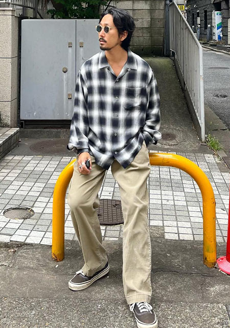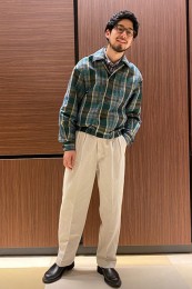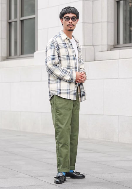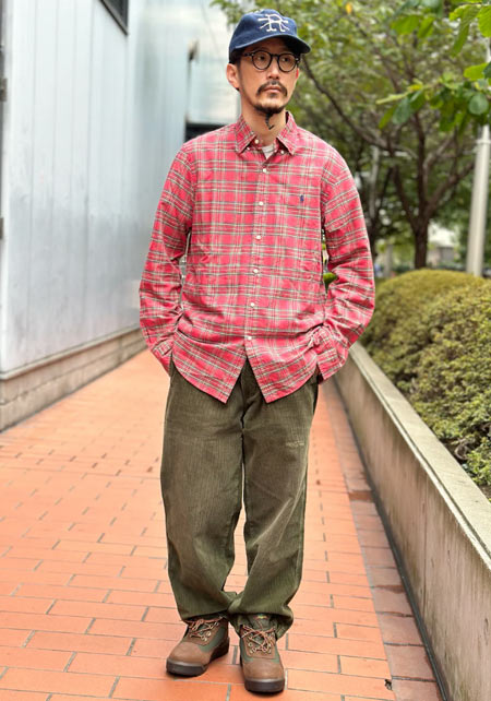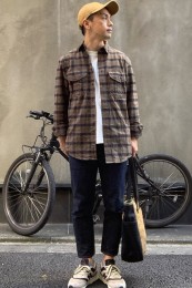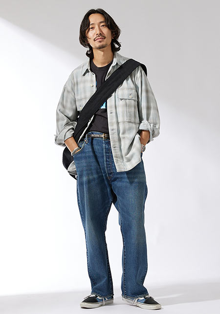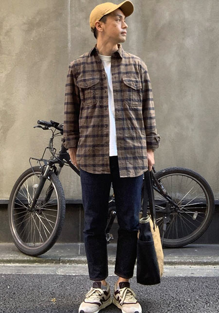 〈コーデ〉アメリカンカジュアルの真髄を踏襲しつつもモダンに仕上げられたネルシャツを、上質感のある白Tシャツとグレースラックスの上に羽織る。絶妙に進化した一枚とドレスな合わせがあればこそ、こういうサラリなこなしが大人っぽくキマるのです。