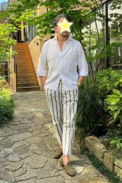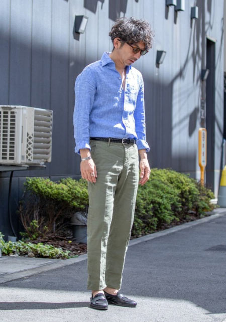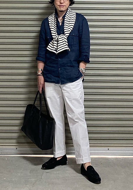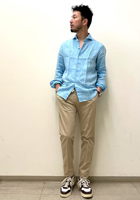 〈コーデ〉ざっくりとしたリネン素材のシャツに合わせるのは、シルク混のコードレーンのパンツ。季節感を素材で醸しつつ、シャツが放つほのかな光沢が大人のエレガンスを物語ってくれます。