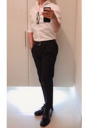 〈コーデ〉白シャツとクリース入りのグレーのスラックスの合わせは、とってもベーシック。ゆえにシックで大人っぽく見えるのです。かといって堅苦しくならないよう、足元はボリューミーなシューズでバランスをとるのが◎。