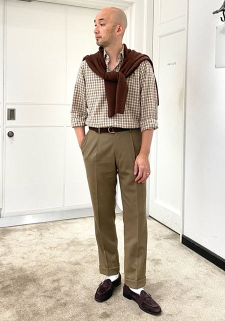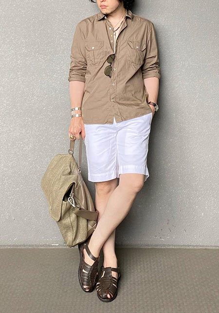 〈コーデ〉アッシュブラウンシャツは合わせるアイテムをブラウン系や白でまとめて、大人のコロニアルスタイルに。優しくフェードした色合いゆえ浮き足立って見えず、大人の装いを格上げしてくれます。