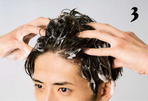 泡立てた泡を頭頂部から足に向かって塗布したら、指の腹で頭皮と髪を洗う。このときゴシゴシと力を入れるとダメージの原因になるので、ソフトに、細かく指を動かすのを心がけて。