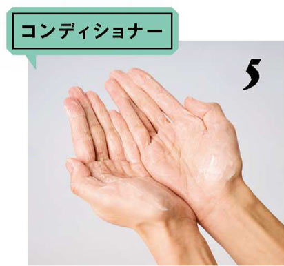 シャンプー後はコンディショナーで髪に潤いを与え、表面をコーティングするのがマスト。まずコンディショナーを手に取り、手のひらに広げて。