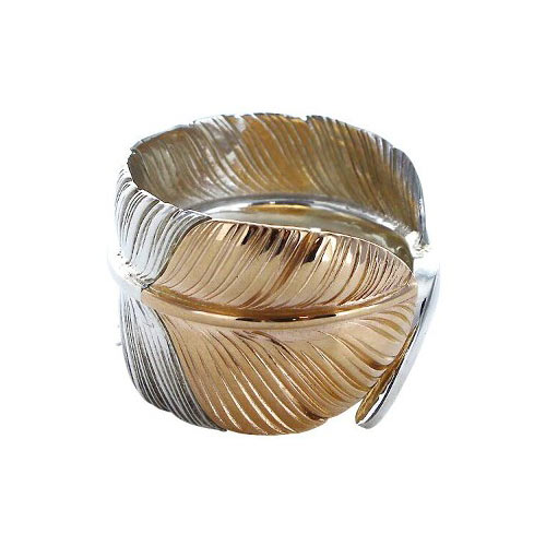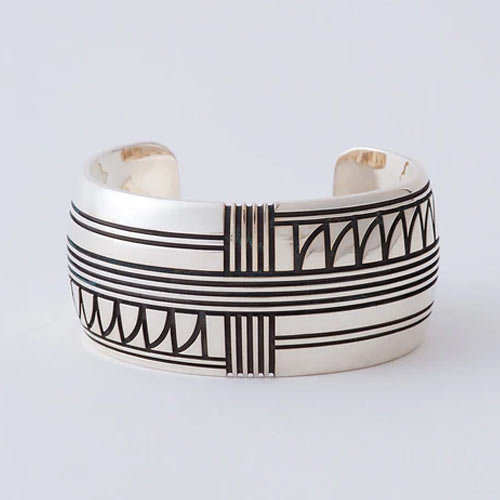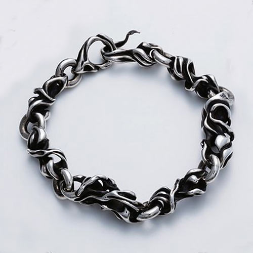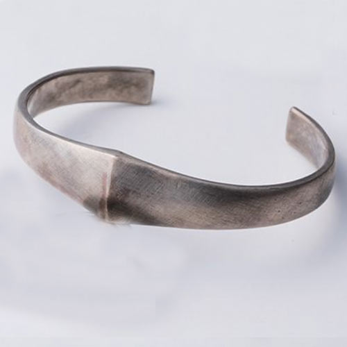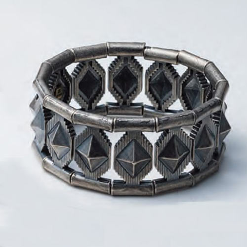 立体的なモチーフが腕を一周する存在感抜群のプレスレット。婚し仕上げを施して重厚感のある作品に仕上げた。11万1000円(税抜)