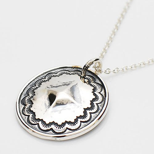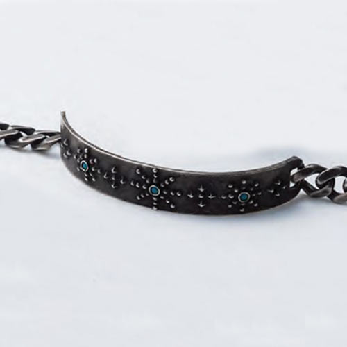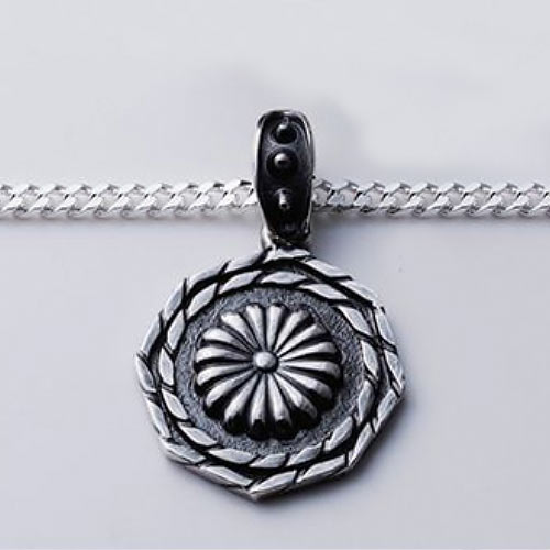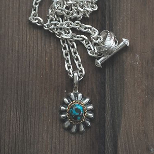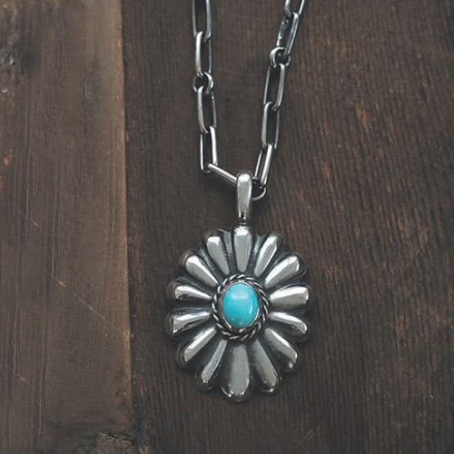 フラワーモチーフのコンチョ中央にはターコイズをあしらい華やかさを強調。重量は8.3gと軽量で着用時に重量感を感じさせにくい。1万2500円(税抜)、チェーン1万円(税抜)